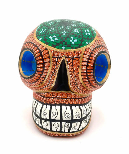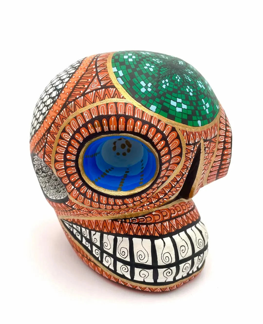Bring home a symbol of strength, mystery, and tradition with this stunning Orange Skull alebrije — hand-carved from copal wood and painted with extraordinary precision by master artisans from Oaxaca.
