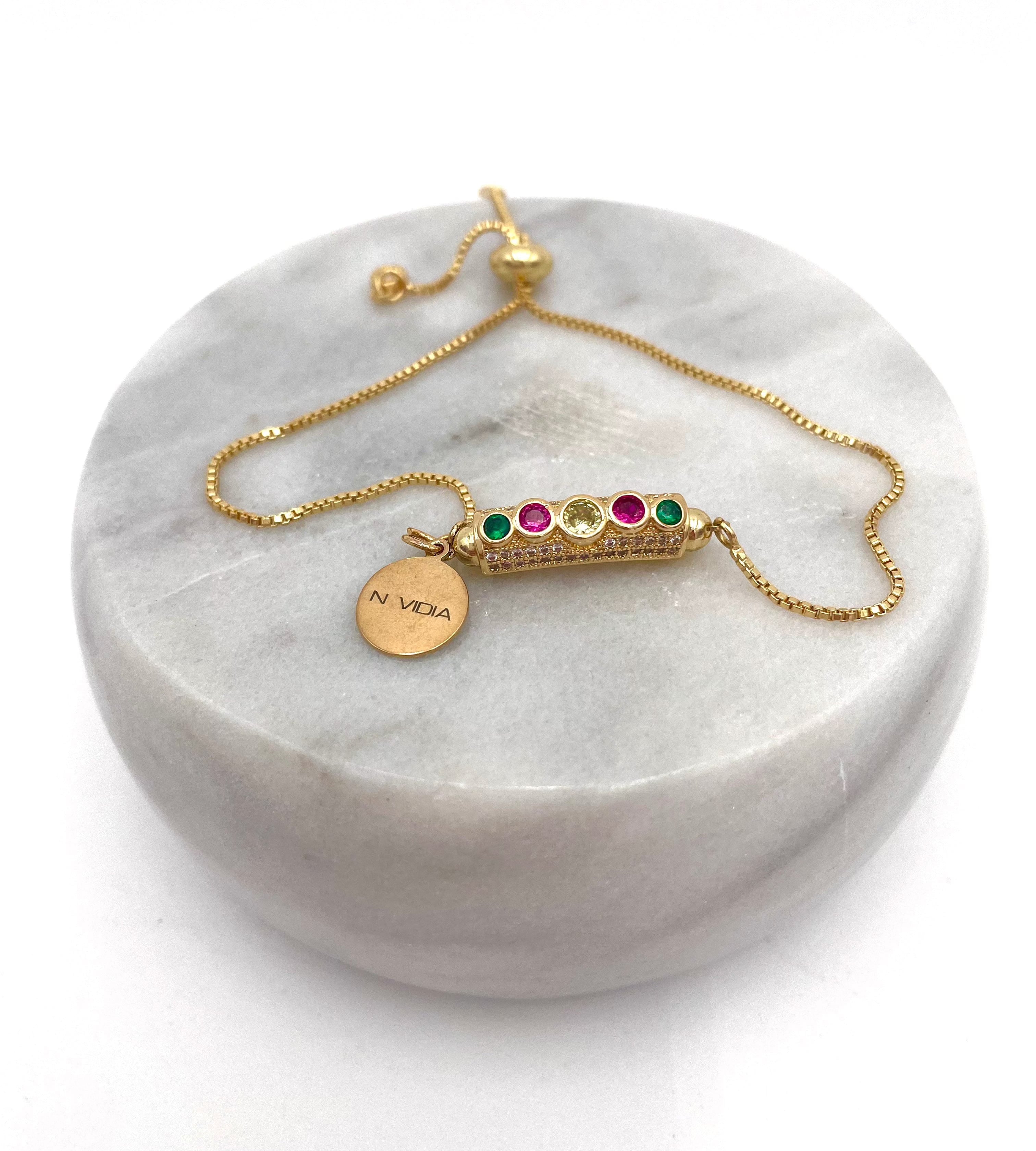 Handmade gold plated bracelet with different charms, natural stones, cubic zirconia with adjustable slider