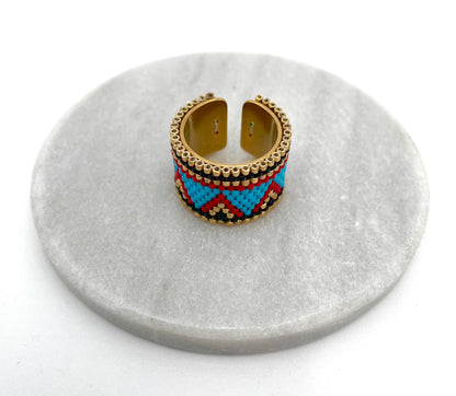 Handmade Wide Band Ring Blue and Red Miyuki Seed Bead